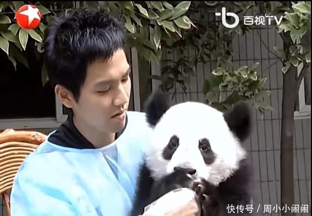 当一只熊猫幼崽从木架子上滚落时,钟汉良忍不住发出了轻轻的笑声。