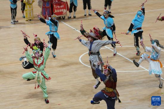 2月28日,来自广东潮汕地区的英歌舞表演队在江南体育馆表演。