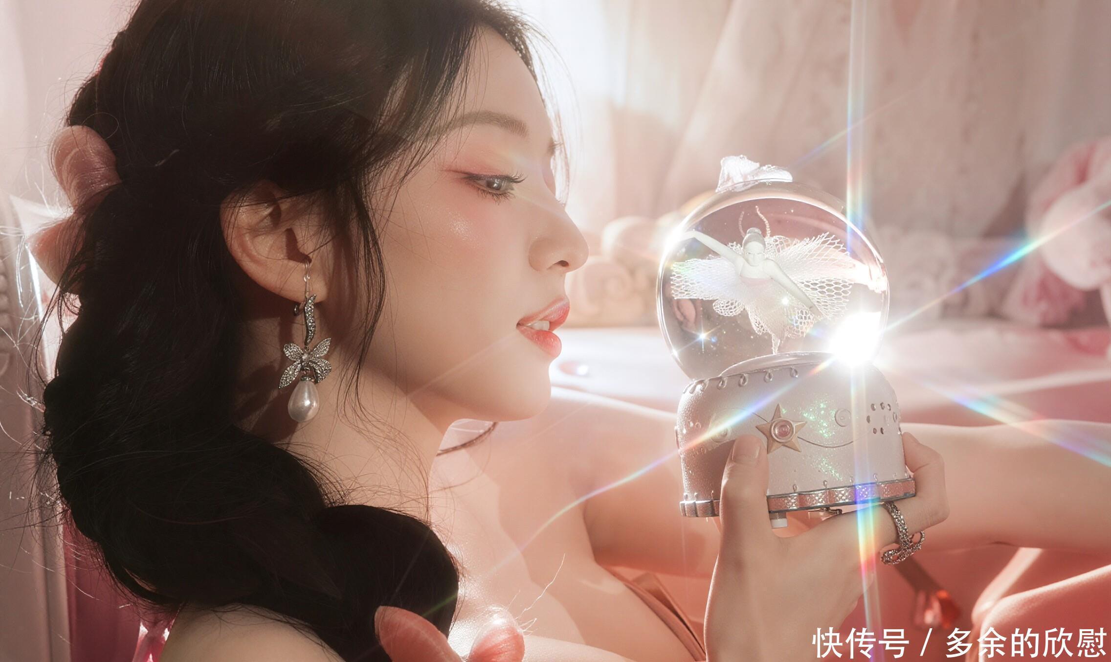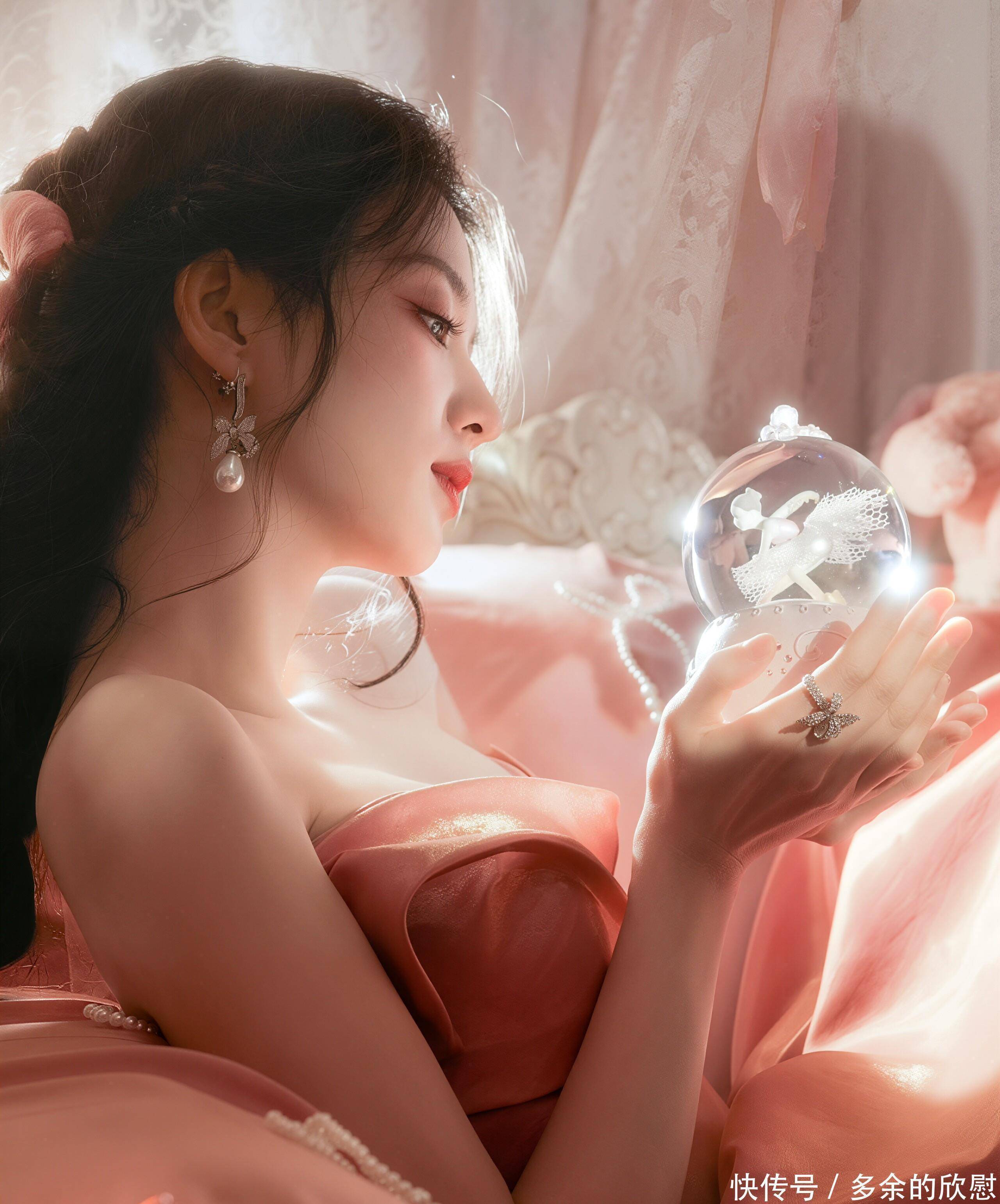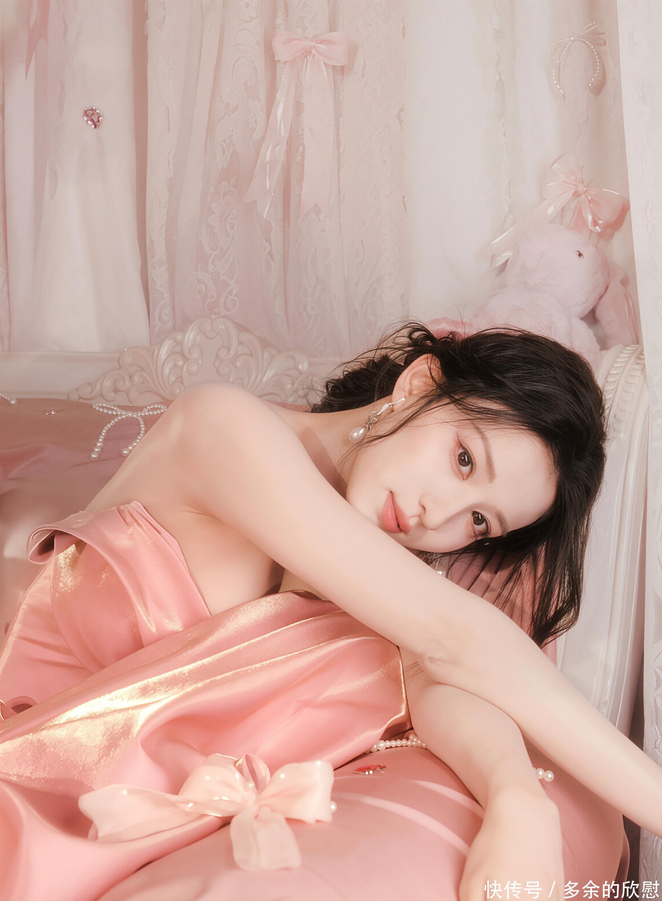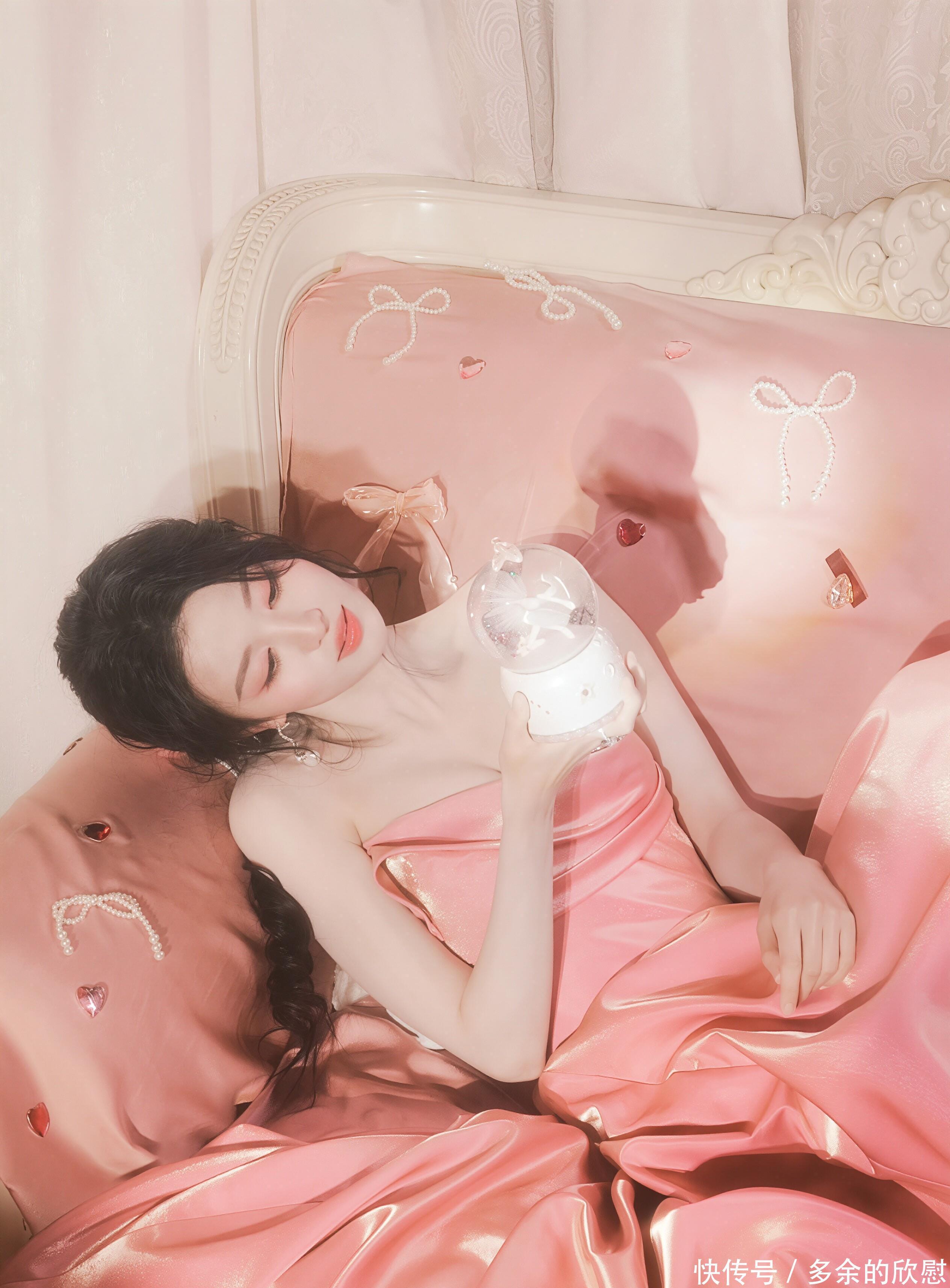 场景布置与造型的适配度堪称绝佳:层层叠叠的粉色纱幔、珍珠蝴蝶结装饰,搭配缀满水晶的双层蛋糕,营造出宛如公主房的梦幻场景。她手持水晶球时眼神温柔缱绻,倚靠床榻时姿态慵懒松弛,托举蛋糕时浅笑嫣然,每一个神态都与粉色梦境的氛围深度契合,仿佛在演绎一场专属的浪漫童话。
