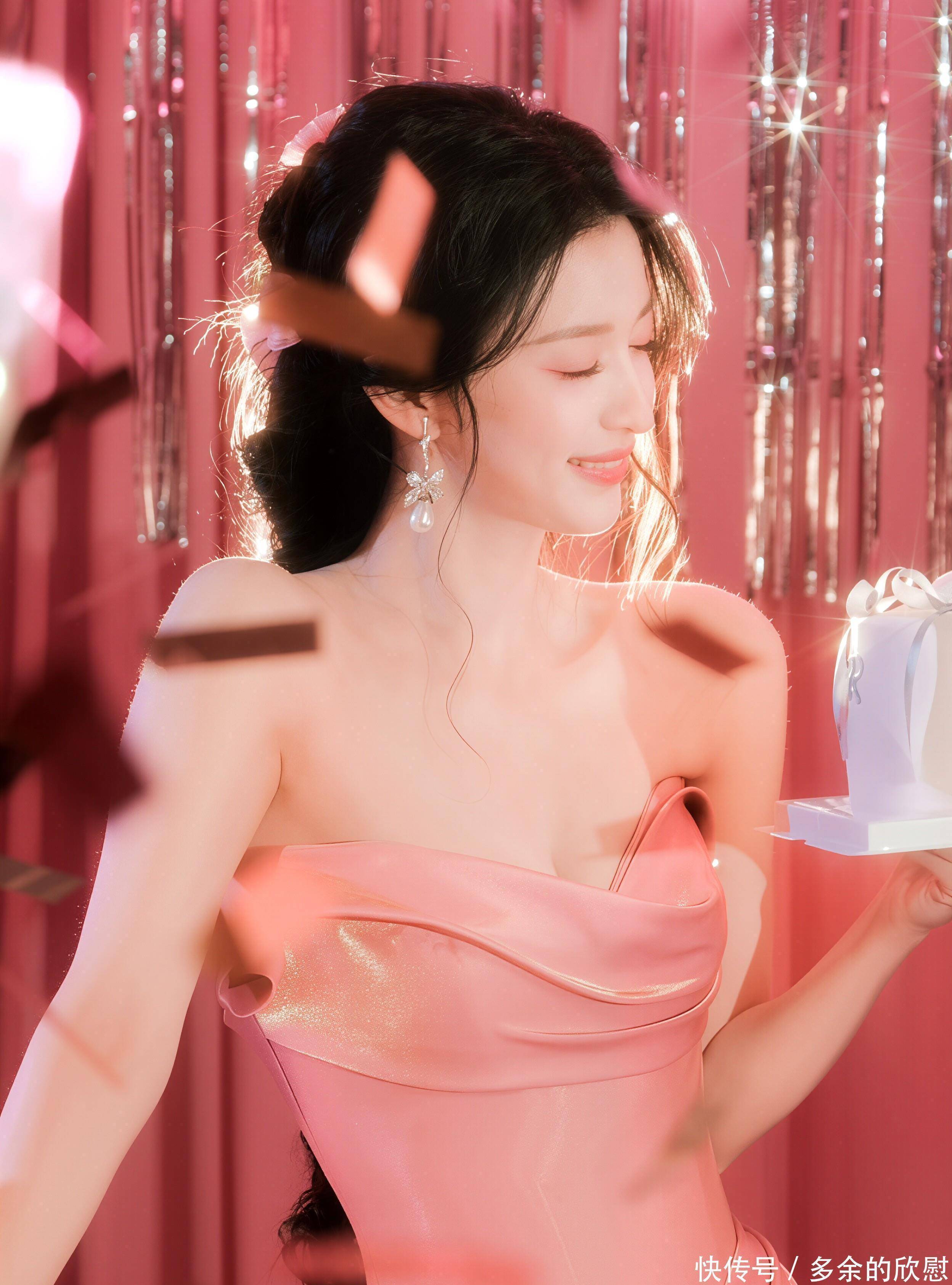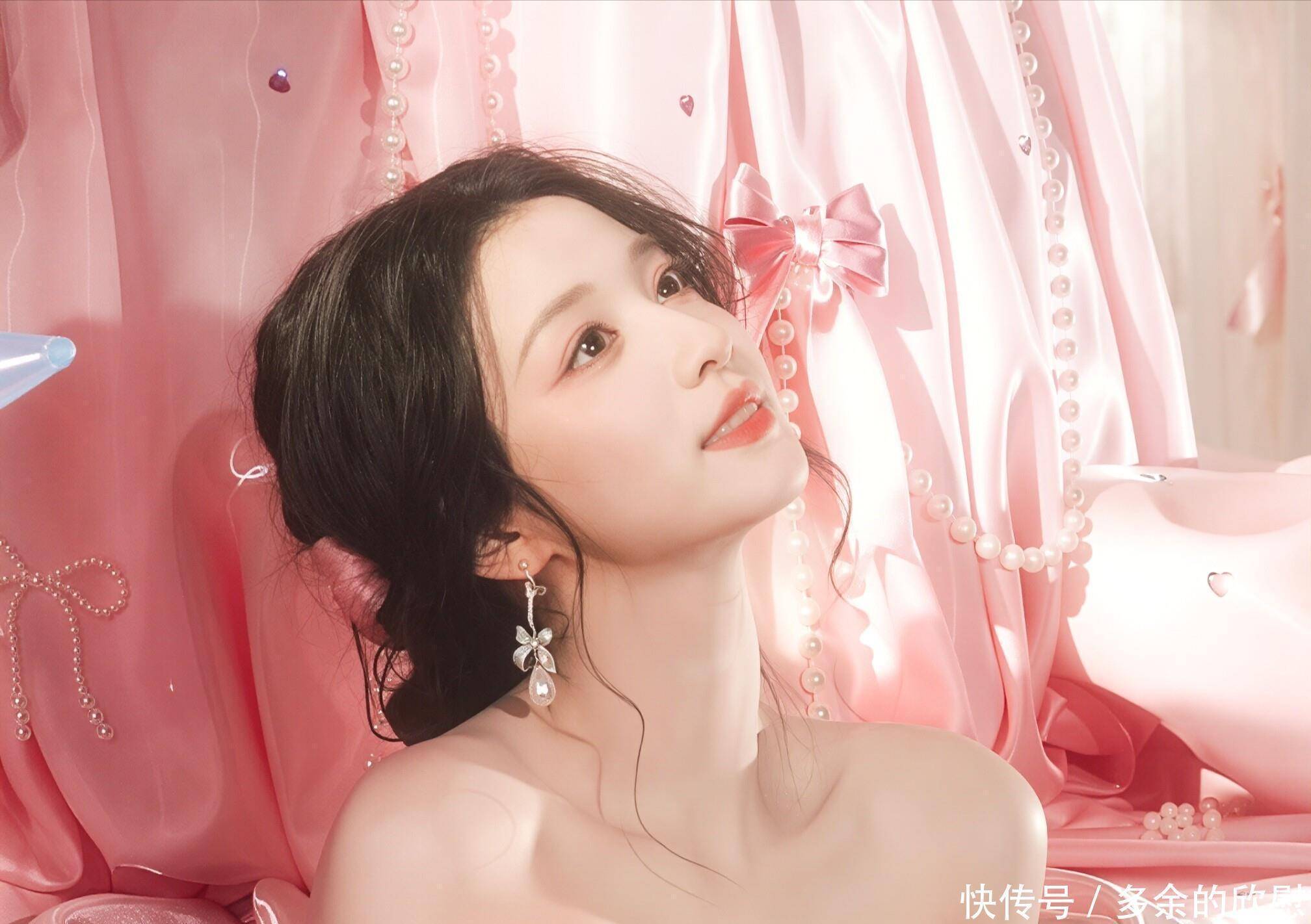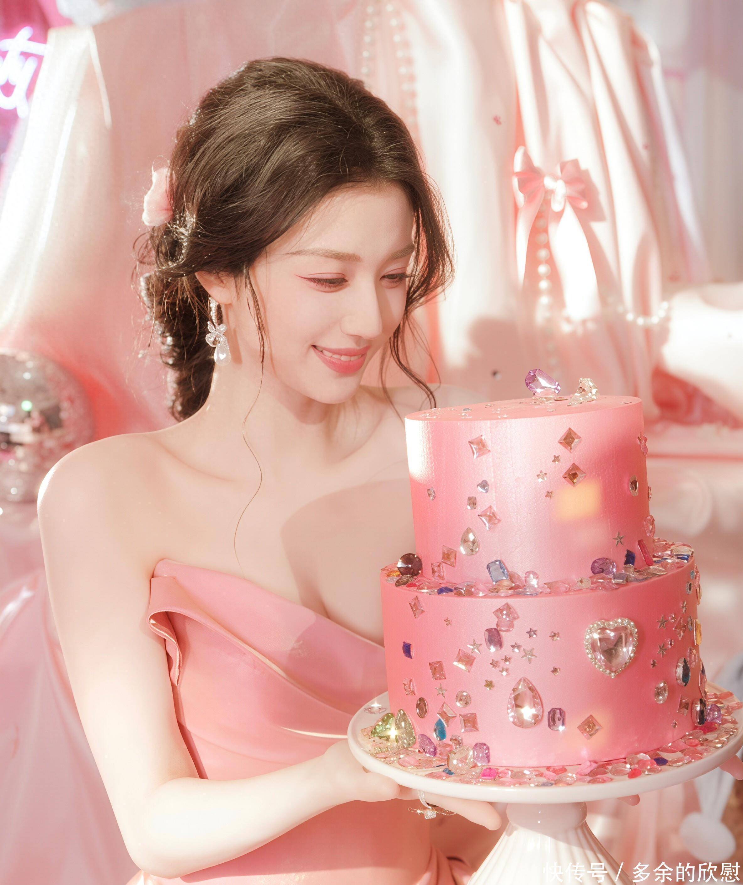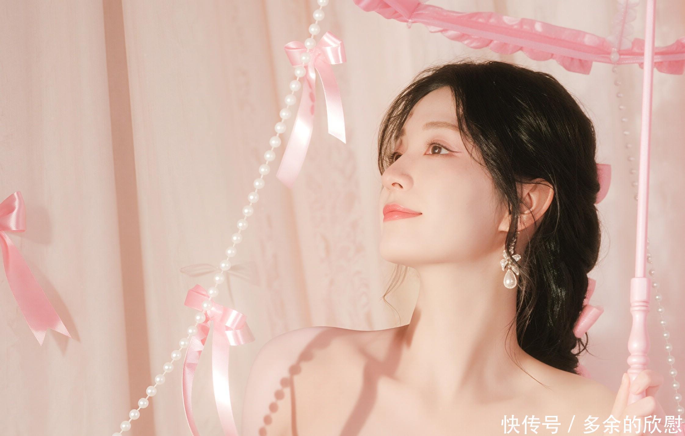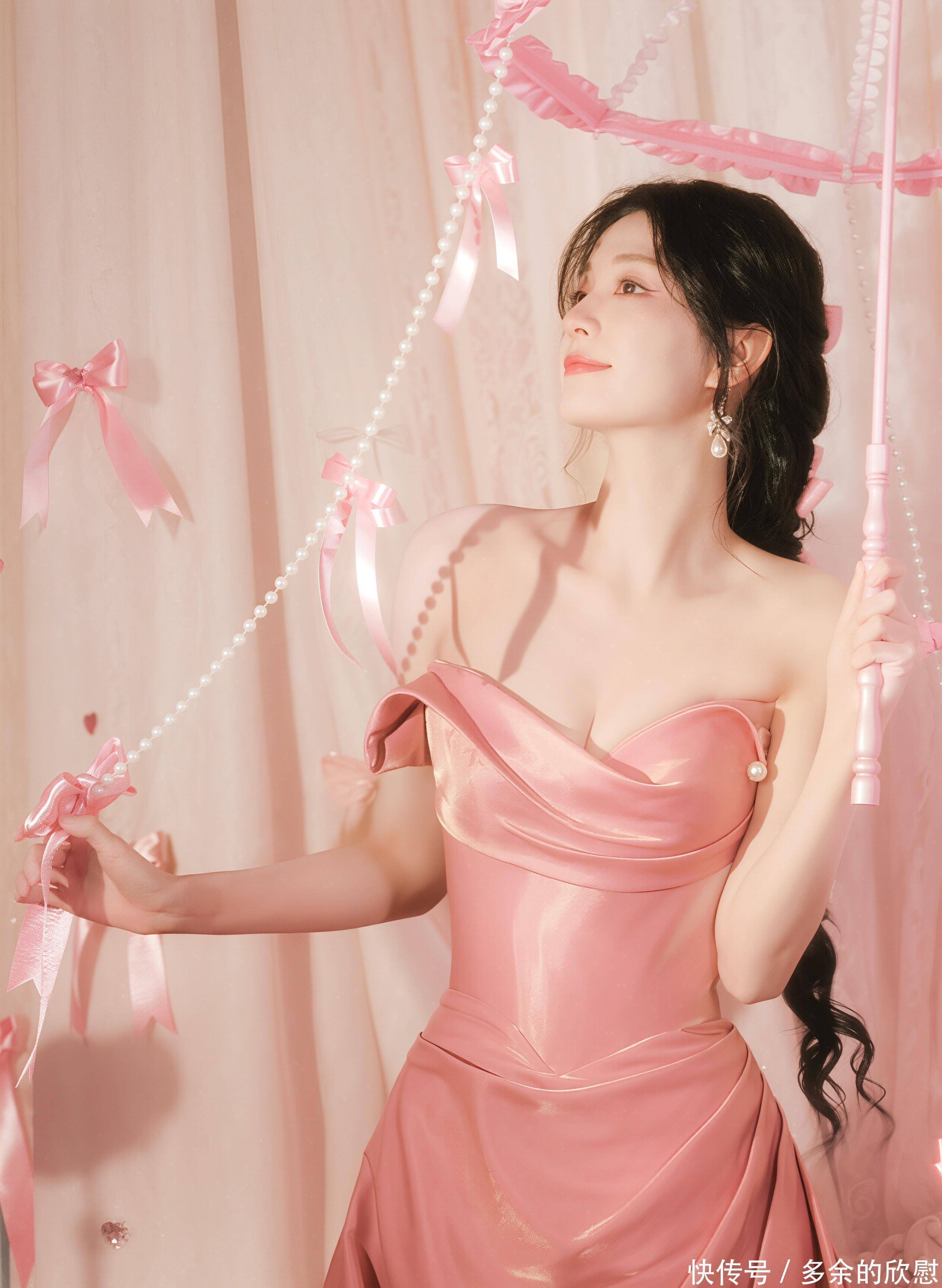 场景布置与造型的适配度堪称绝佳:层层叠叠的粉色纱幔、珍珠蝴蝶结装饰,搭配缀满水晶的双层蛋糕,营造出宛如公主房的梦幻场景。她手持水晶球时眼神温柔缱绻,倚靠床榻时姿态慵懒松弛,托举蛋糕时浅笑嫣然,每一个神态都与粉色梦境的氛围深度契合,仿佛在演绎一场专属的浪漫童话。